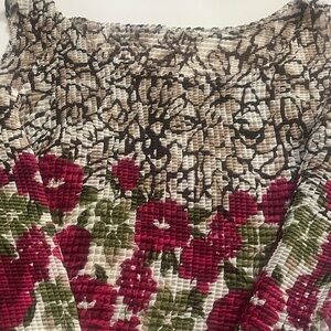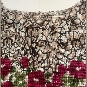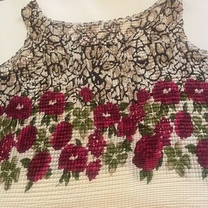 Stylish sleeveless top with a unique textured design. Features a floral pattern in red and green accented with cream and brown. Relaxed fit perfect for any occasion.