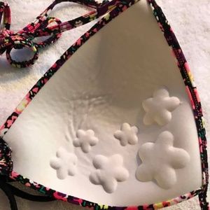 Style it up with this colorful Bathing Suit! The top displays black with a pink, orange and red floral pattern, and ties around the neck and back. In the top are flower-padded cups for extra support. The silky yellow bottoms have a shiny square golden buckle at each hip, fashioned with an intricate design. These pieces were sold separately. The top is by Arizona (XXL-but run smaller) and the bottoms by Trina Turk (L)---together, they make a stunning pair and are a real eye-catcher!