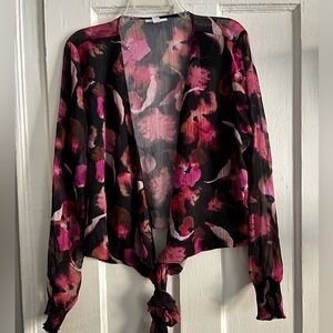 Floral Tie Front Blouse Size XL Black Pink Wrap Top Sheer Smocked Cuff BAR lll