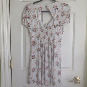- Floral dress with cap sleeves, a tie in the front, and a smocked back