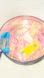 Round tin box with floral design. Includes various small accessories.
