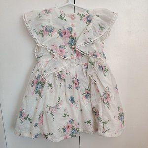 Floral white, pink, and blue dress with ruffle sleeves and matching bloomers. Sweet floral button detailing on the back. Perfect condition. Beautiful spring or Easter dress.