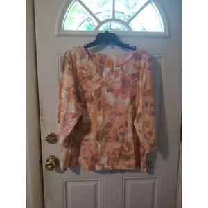 Floral Top 2X Ruby Rd Water Color Floral Pink Gem Beads Neckline Long Sleeve