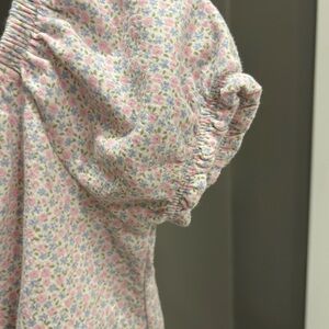 Soft floral blouse with slightly puffed sleeves. Features a pink and white pattern. Scalloped hem and cinched sleeve hems. No spots or flaws.