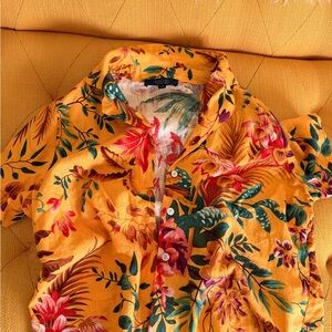 Lightweight floral button-up top and matching skirt. Bright pink and red blooms with green leaves on background. Playful and breezy. Perfect for warm-weather outings.