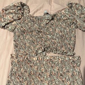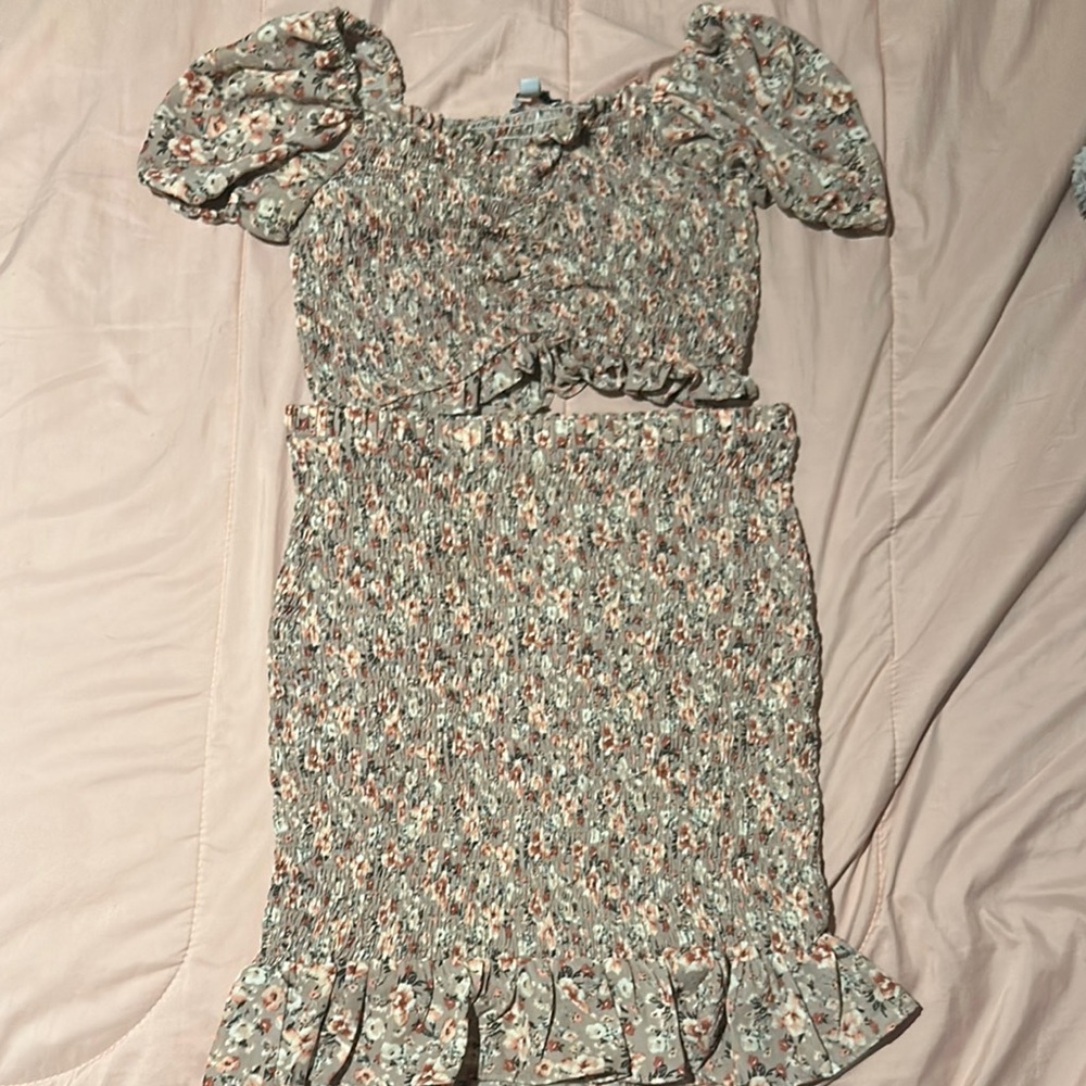 Chic floral two-piece set featuring a top and skirt. Ruffle hem adds a playful touch. Perfect for casual outings.