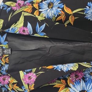 This SOHO brand long, unstructured jacket has a beautiful , multi-colored floral patter. It comes to mid thigh and is perfect over a LBD or really any color underneath. Open lapels and button detail on sleeve.