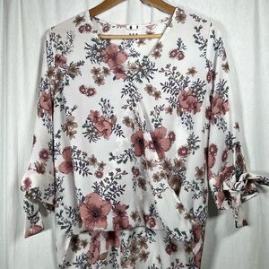 Discover elegance with this floral V-neck blouse. The white and pink design adds a touch of sophistication to your wardrobe.