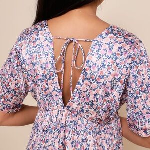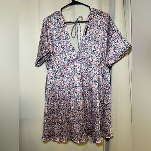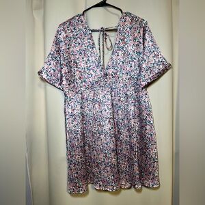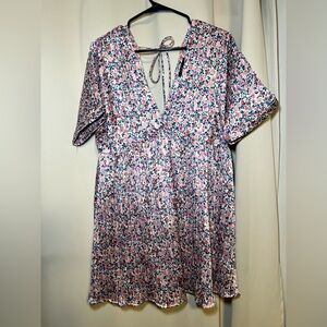 Chic floral dress with a V-neck design. Features a mix of pink, blue, and white colors.