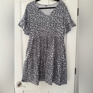 Chic floral dress with a V-neckline and ruffle sleeves. Features a black and white floral pattern.