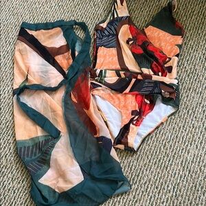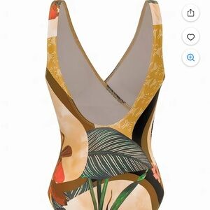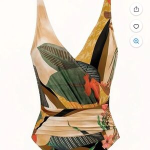 Embrace elegance with this floral V-neck one-piece swimsuit. The blend of green, orange, and cream colors creates a chic look for any beach outing.