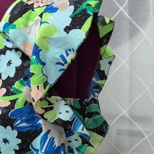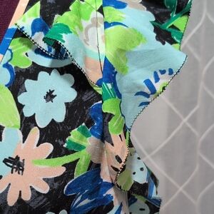 This vibrant floral top features a V-neck and ruffle sleeves, perfect for adding a pop of color to your wardrobe. The mix of blue, green, and black creates a stunning look.