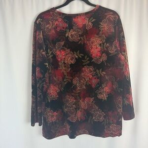 This stunning floral velvet blouse combines rich red and black hues for a chic look. Perfect for any occasion.