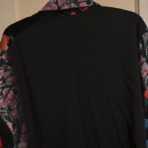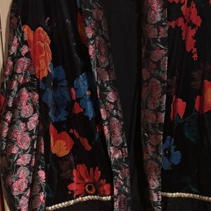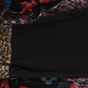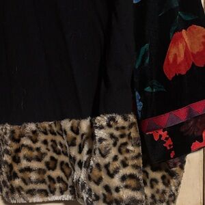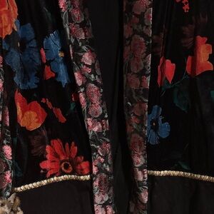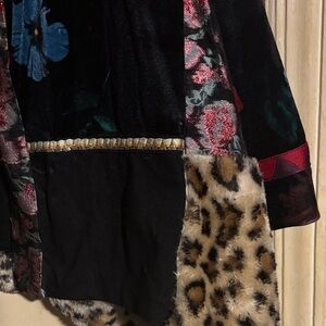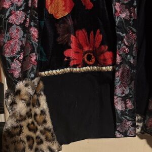 Zara beautiful double lined multi media/mixed prints of floral a faux fur leopard, open front Luxurious velvet jacket or kimono. featuring a vibrant floral design. Perfect for adding a touch of elegance to your loungewear collection. Can be worn as a jacket or throw a T-shirt & jeans and make it casual. This short kimono has a mixed prints definitely an eye catcher and unique. The only reason I’m letting it go is it no longer fits me due to weight change. I love this jacket. People will look twice when I r wearing it! Worn two times. This is a size large (size tag missing). Will fit a larger medium thru an x-large. This kimono/jacket has no front closure. Great item to add to your closet! By looking at the pictures you can see it’s multi colored and has different Coker’s and v whymnnnlllllll