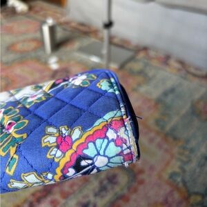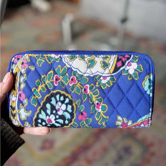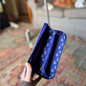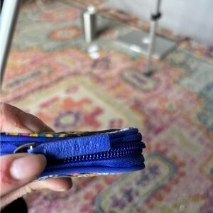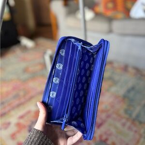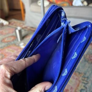 Vibrant blue quilted wallet with floral patterns. Features a zip-around closure. Some wear on bottom corners of exterior. Interior is flawless. Design hides exterior flaws but they’re there.