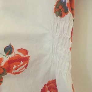 White cotton short sleeve shirt with orange tea rose print. Flattering ruched waist and peplum! So sweet and summery.