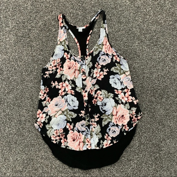 Volcom racerback button front tank top. front is a floral pattern and back is solid black with the hems floral. size extra small but can definitely fit small. barely worn excellent condition.