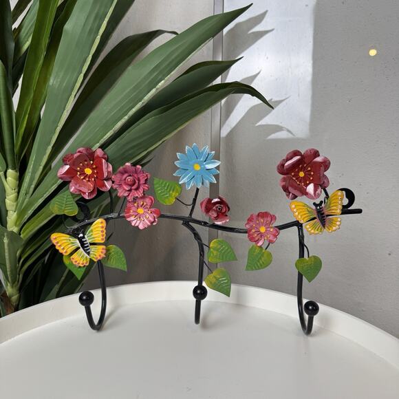 Fairy Garden Floral Coquette Ethereal Bohemian Butterfly Metal Wall Rack 3 Hooks