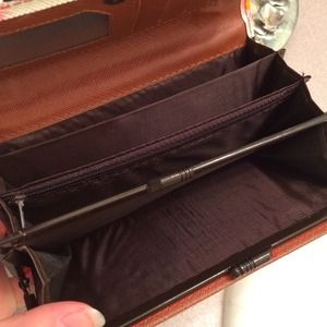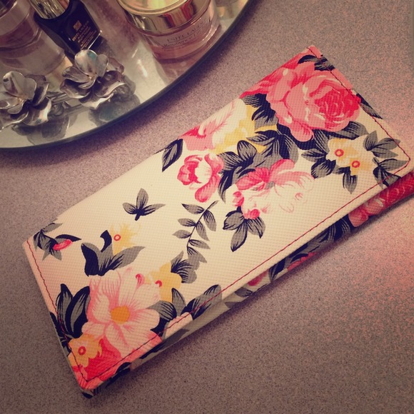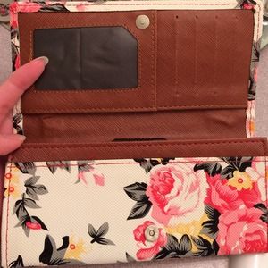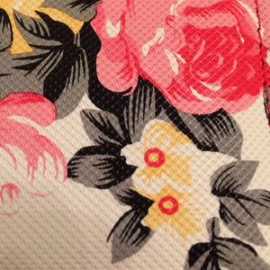 A floral wallet with black leaves and mostly pink and yellow flowers. Second picture shows texture. There are several coin slots, ID slot, several slots to place cash, and a coin pouch area. Brand new and will be in a plastic baggy. 💐💐
