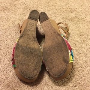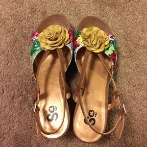 Very cute silky floral wedges with flower embellishment. Worn three times max, just a smidge big on me. Brand is "So" by Kohl's