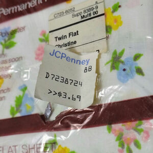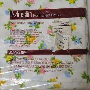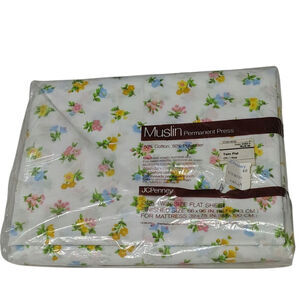 Floral White Muslin Permanent Press Twin Size Flat Sheet New Vintage JC Penney. Multi-color flowers on white background. 128 threads per square inch. Machine wash; tumble dry.