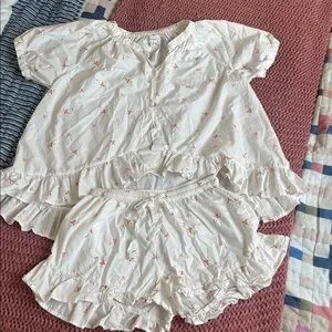 Experience comfort and style with this floral white ruffle sleepwear set. Perfect for a cozy night's sleep.
