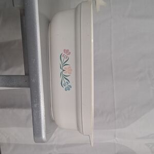 White storage container with floral design. Features pink, peach, and blue flowers. the small one is 1.5 qt and the bigger is 2.5. these are the microwavable bowls
