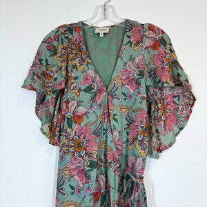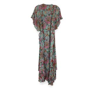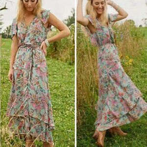Haute Hippie Floral Wrap Maxi Dress Cottagecore V-Neck Romantic Blue Pink Size Medium