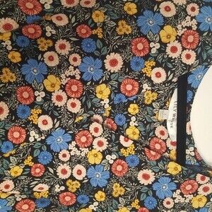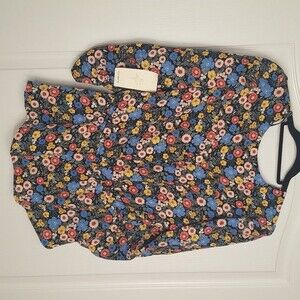 Multi color floral pattern on black background blouse by Lily White. 3/4 sleeves with elastic ruching on sleeves. Faux wrap style with elastic in the waist. New with tags. size Large.