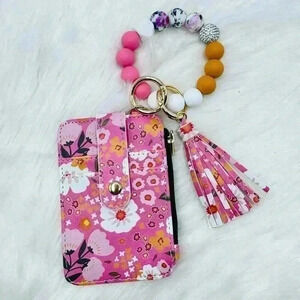Floral PU Leather Tassel Wallet With Silicone Bead Keychains