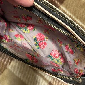 Chic wristlet featuring a floral design with pink roses. Perfect for a night out.