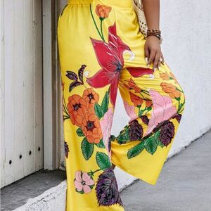 Brighten your wardrobe with these vibrant yellow wide-leg pants featuring a stunning floral design. Perfect for a bold and stylish look.