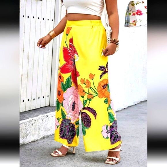 Brighten your wardrobe with these vibrant yellow wide-leg pants featuring a stunning floral design. Perfect for a bold and stylish look.