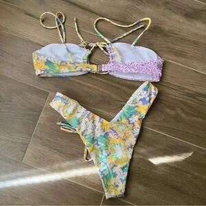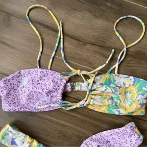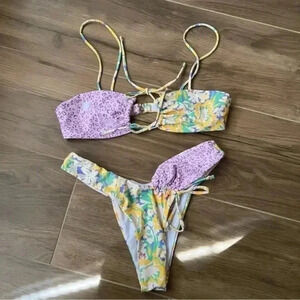 Mixed contrast print bikini set. Keyhole with self tie in front. Cinched bottoms. Both size small. Never worn