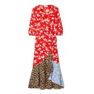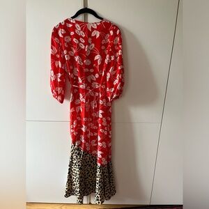 This vibrant wrap dress features a striking combination of red floral and leopard print patterns, accented with a touch of blue. Perfect for making a bold statement.