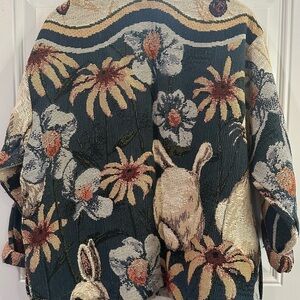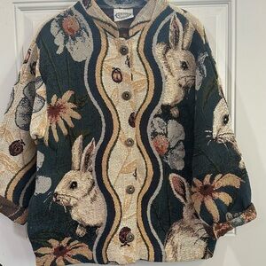 VINTAGE sugar street weavers rug jacket featuring a unique floral and rabbit design