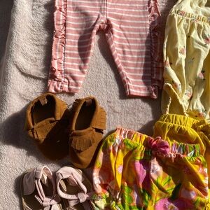 Adorable babygirl size 0-3 month clothing/shoes bundle featuring vibrant floral and striped designs. Perfect for playful days.