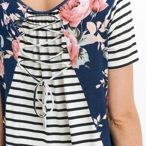 Wow! Look at this beautiful short sleeve print top with striped back detail. Stay happy