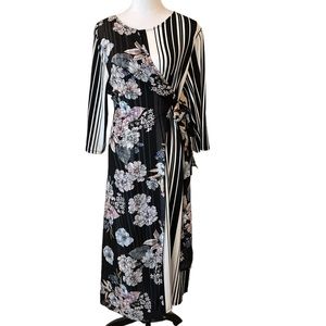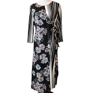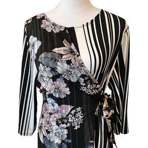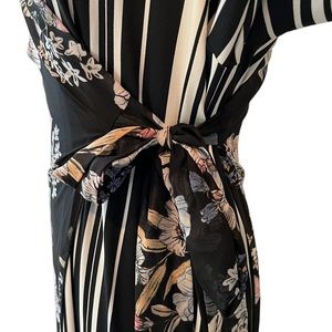 Elegant wrap dress featuring a striking floral and striped design. Perfect for any occasion.