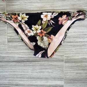 In wonderful condition, Floral bikini ruched butt bottoms XL. The liner somehow got stuck to the fabric and has not fully come off yet, comes off more each time in the wash. So little let not noticeable when wearing and cant be seen through.