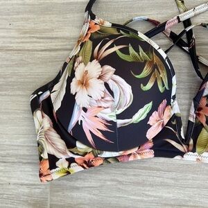 Floral bikini ruched butt bottoms XL, V front racerback tie back for top 36D