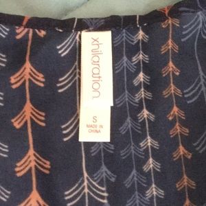 Beautiful navy blue sheer blouse with a tie in the back. Dolman sleeves. Turquoise, orange, and cornflower blue, purple and cream.