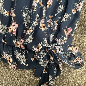 Pretty floral blouse with vneck, tie detail at waist and ruffle detail at waist and sleeves. So cute for spring. Wore once. Just don’t wear anymore.