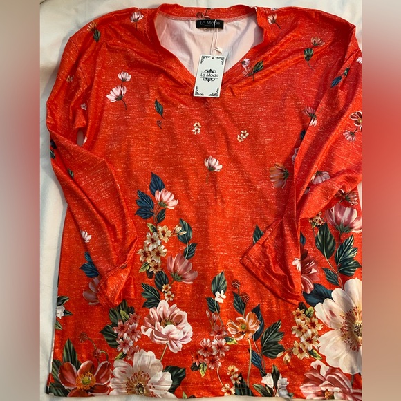 Cute, soft, floral blouse. Doesn’t indicate size but it is an XL. Color is like a reddish orange. Non-smoking/pet friendly home NWT