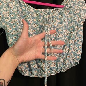 Blue and white cropped floral blouse