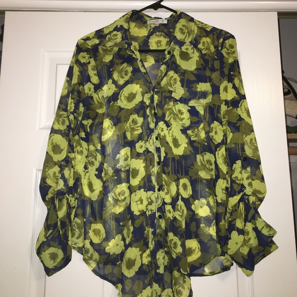 Polyester floral collared button down, navy blue and yellow