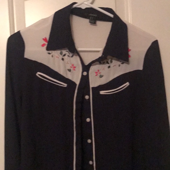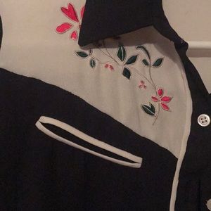 Forever 22 blue and light gray button up. Floral design on the collar bone area with white trim on the cuffs.