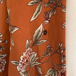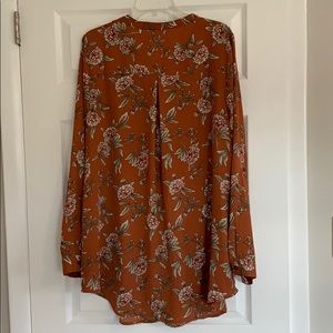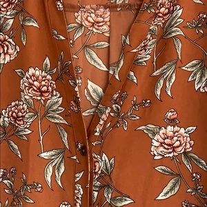 This is a beautiful tunic button down blouse. It comes with a belt that I am missing but could be easily replaced with a thin belt or worn as is. It has a buttoned cuff and a button mid length to roll the sleeves up. Lightly worn but in great condition!