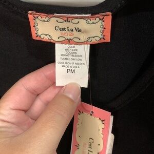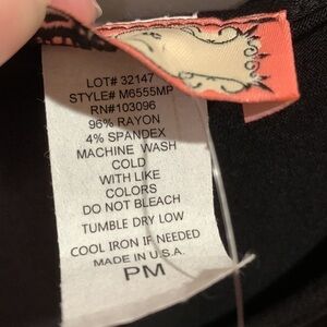 New with tags. Size petite medium. On the longer tunic side in length. Features a colorblocked pattern with a floral stripe print at the bottom. The colors are black, white, pink, and green.