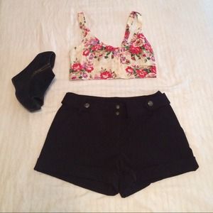 This crop top has a beautiful floral design and has a cream color in the background. It has beautiful buttons up the center and a stretch back for a perfect fit